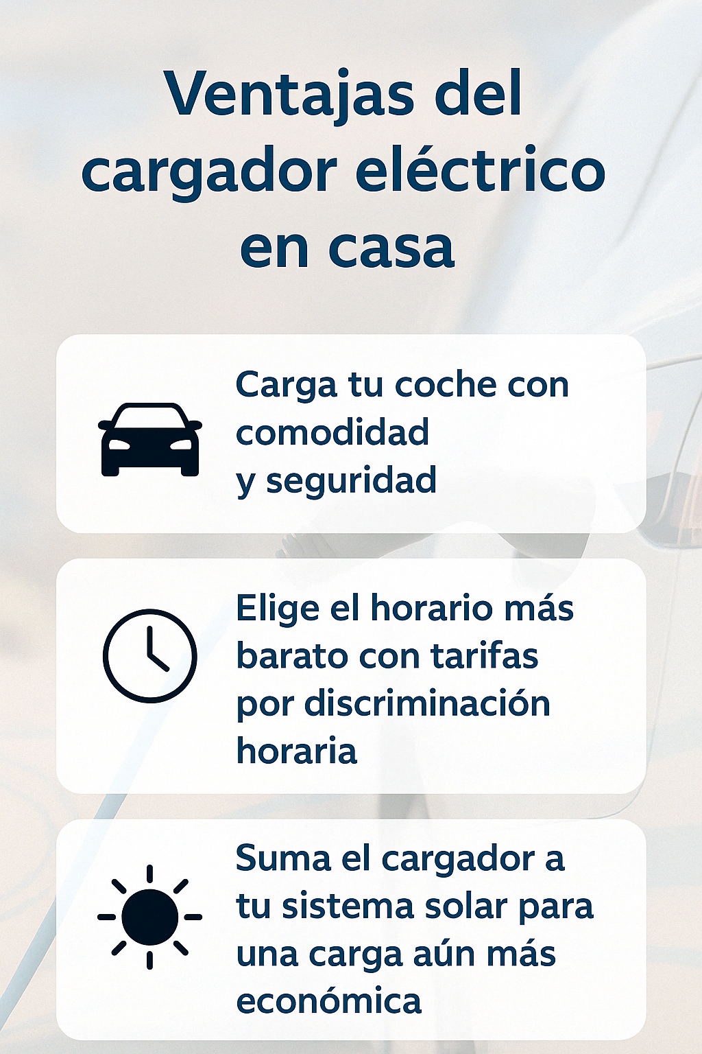 Integramos cargadores monofásicos o trifásicos compatibles con todo tipo de coches eléctricos, optimizando el consumo en tu hogar.